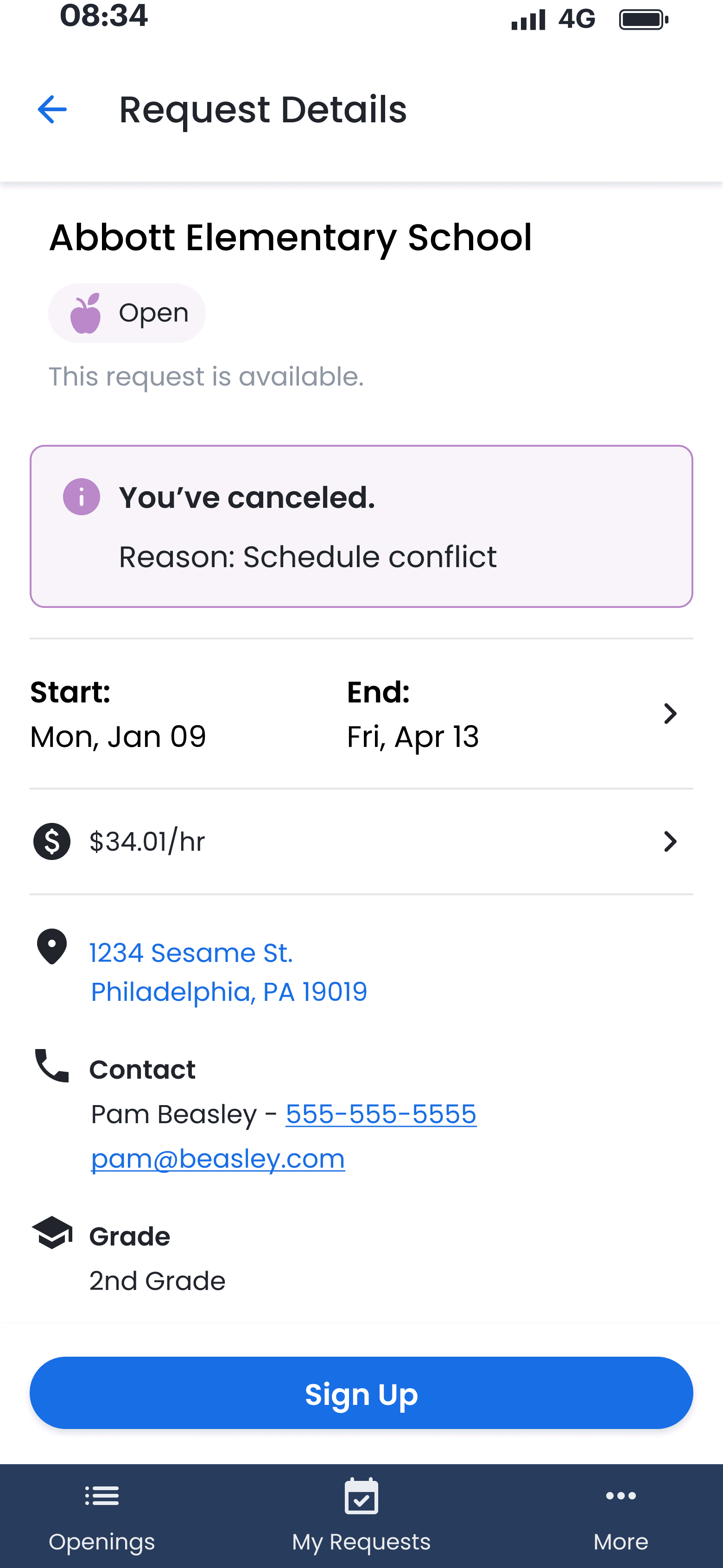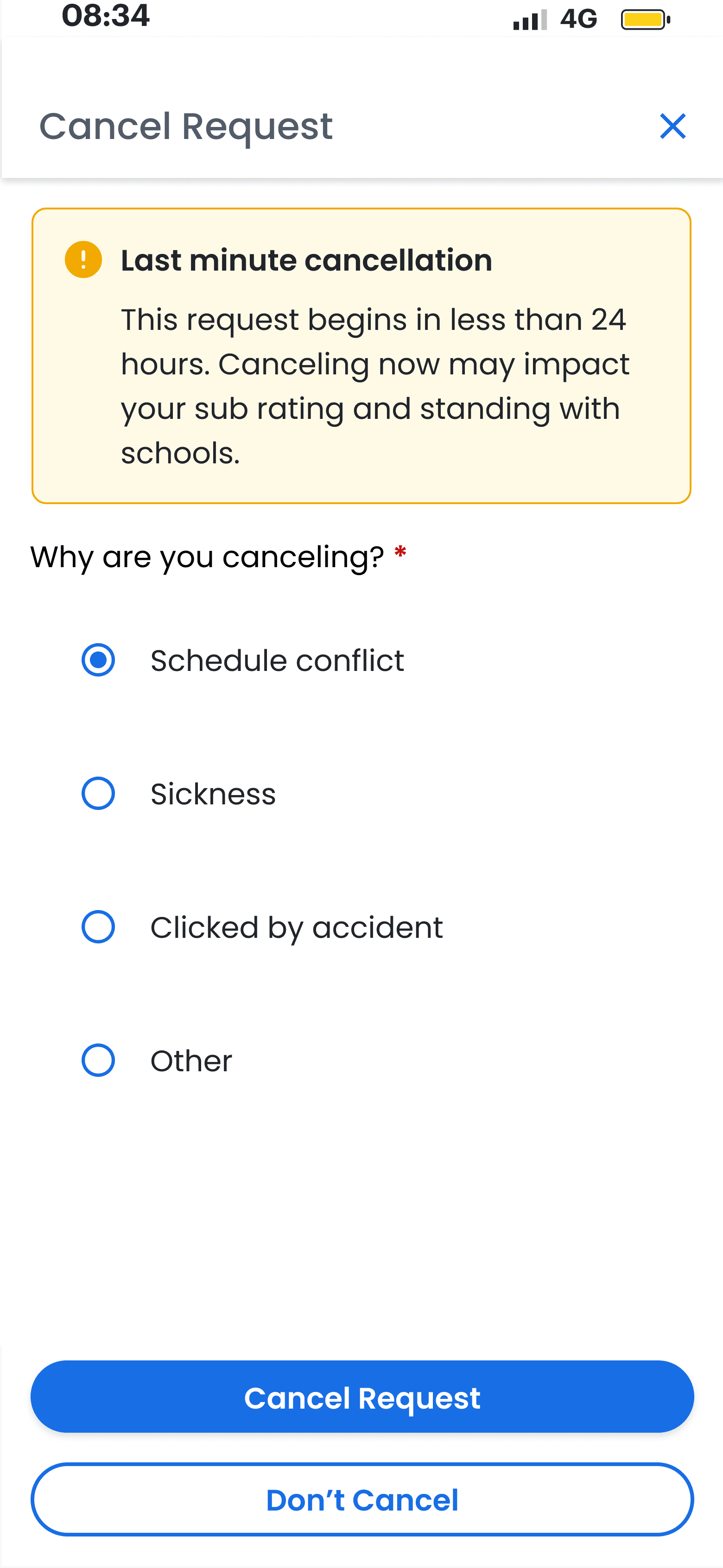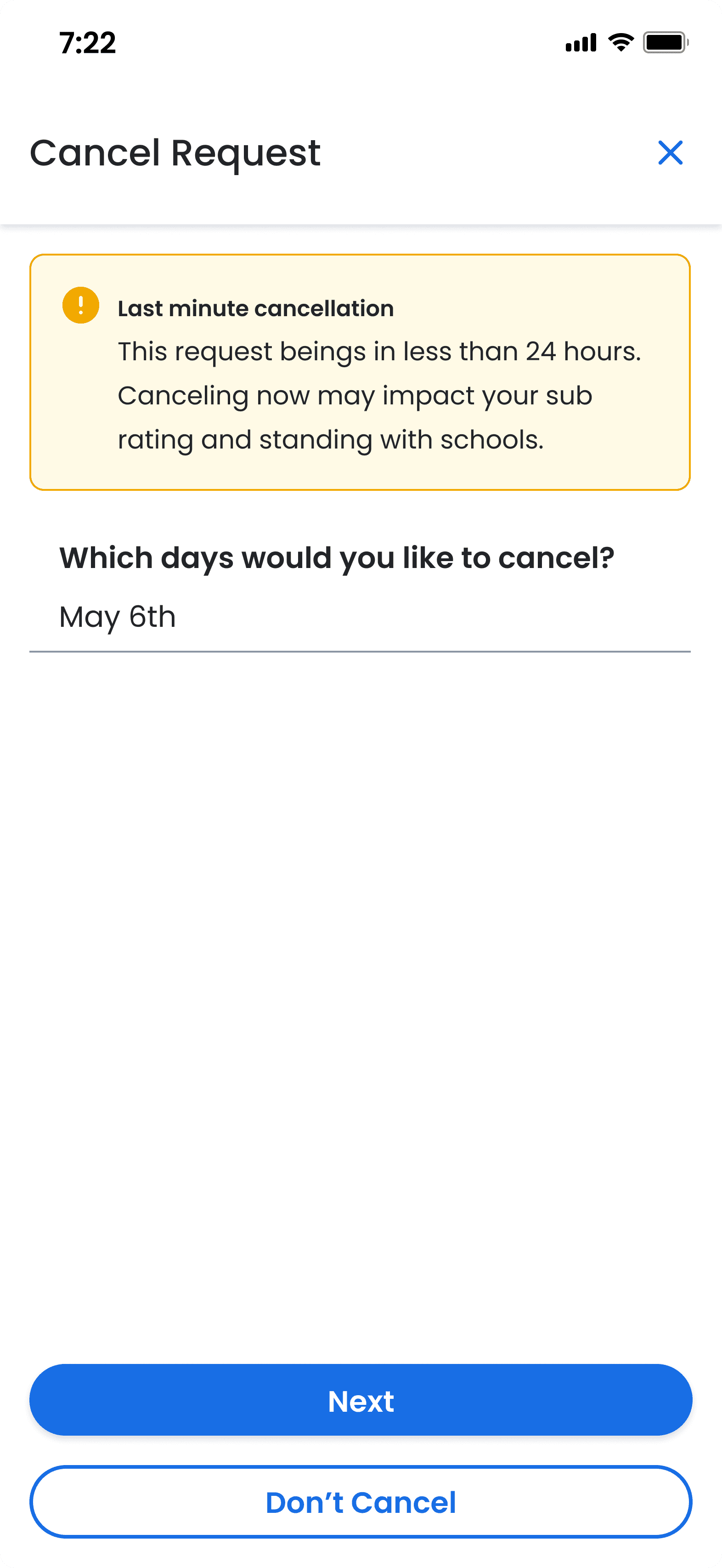 For the MVP, we made no changes to the admin app. The sub app designs relied on existing components to indicate flexibility and capture availability. Subs submitted their availability through a form on the Request Details and Customer Support coordinated with schools to update the requests manually.