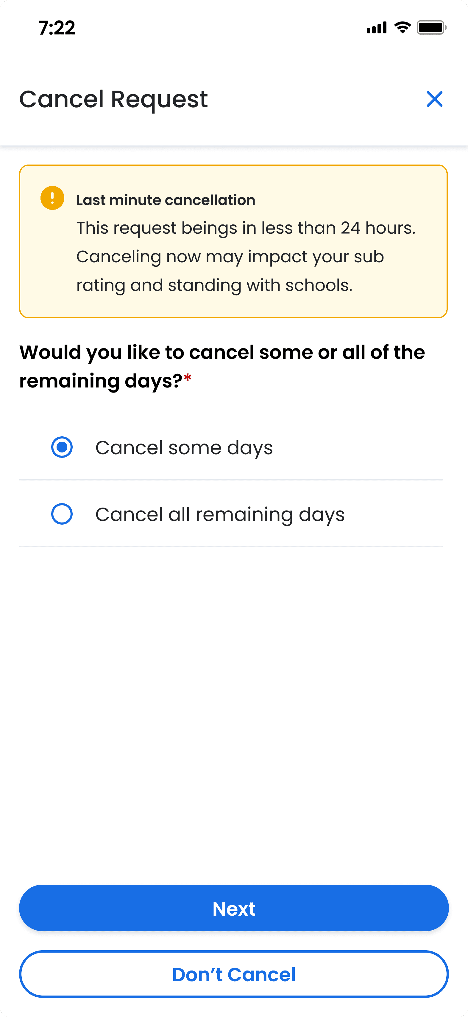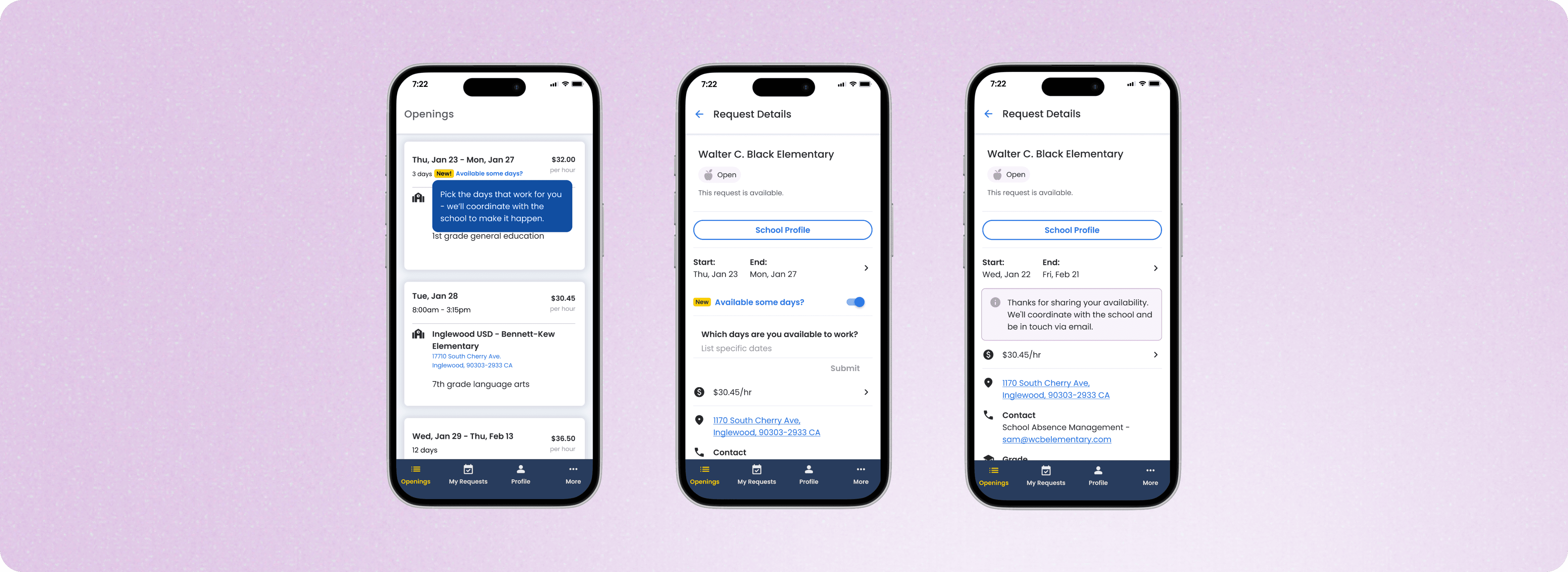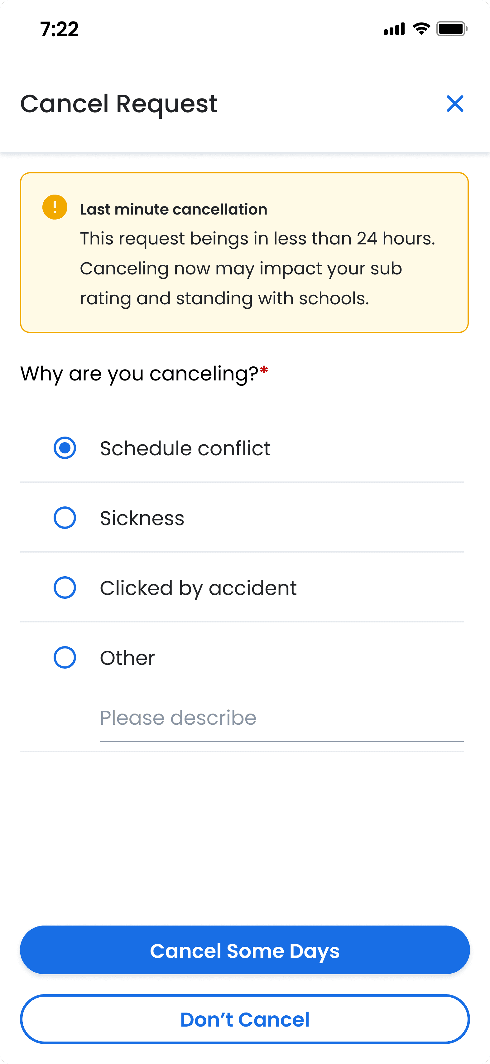 User interviews confirmed that subs valued flexibility and surprisingly, school administrators valued coverage over consistency. Given this user feedback, we believed that flexibility would be a win-win scenario for both user groups.